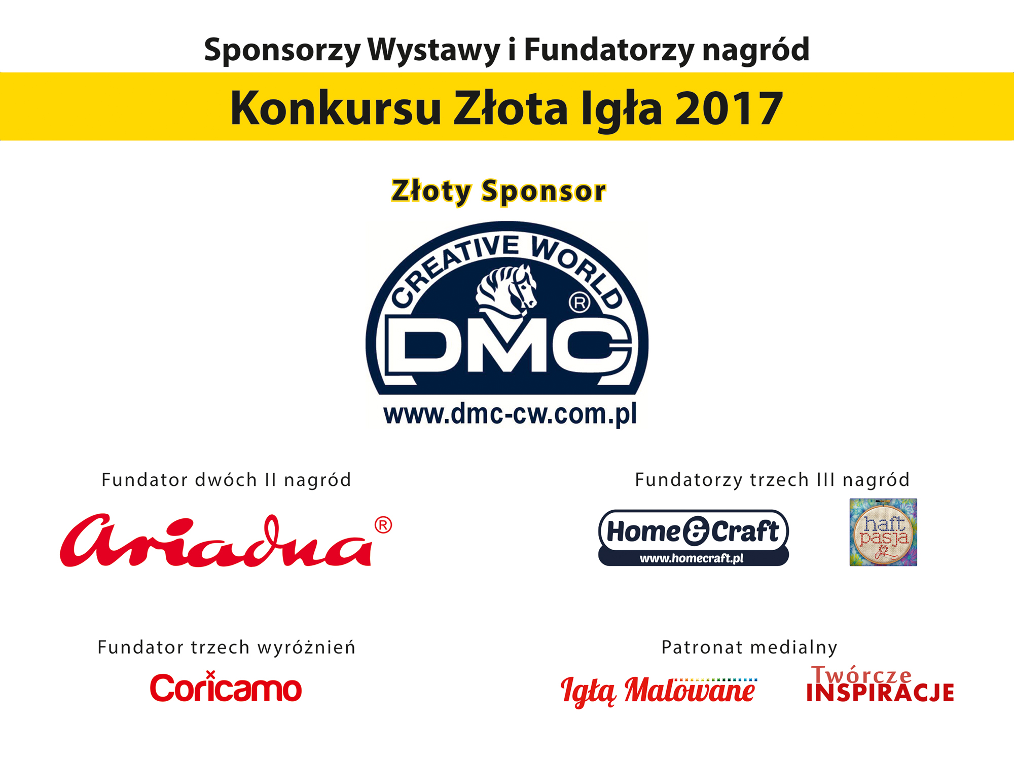 Sponsorami wystawy i Fundatorami nagród w konkursie "Złota Igła" są: DMC Creative World - Złoty Sponsor, Ariadna S.A. FABRYKA NICI - Fundator dwóch II nagród, Home&Craft (Fundator dwóch III nagród), Haftpasja (Fundator III nagrody), Coricamo (Fundator trzech wyróżnień). Patronat medialny nad wystawą objęli: Igłą Malowane, Twórcze inspiracje.